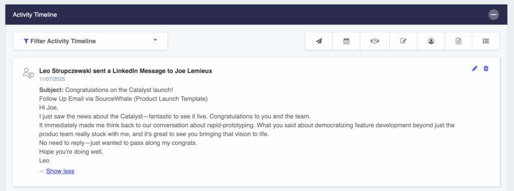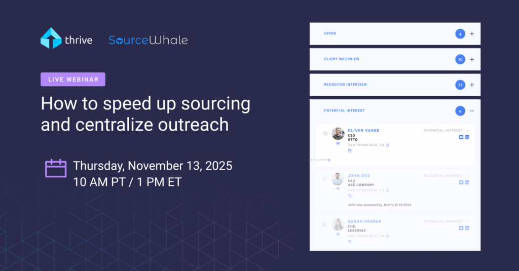 Executive search requires long-term, strategic relationship building with high-potential leaders before you necessarily have a role for them. When leaders effectively expand beyond active searches to build long-term talent relationships, it pays off not only in hires but also in intelligence and future-proofed leadership. Here are Thrive’s top five features that help you nurture executive relationships efficiently while maintaining your differentiated, personal touch. 1. Get the right executives into focused networks When engaging executive talent for tomorrow’s needs, a common mistake is trying to build relationships with everyone, everywhere. This isn’t sustainable and rarely shows results. Instead, start with a narrow, focused goal, such as leaders in a particular function. Create a specific project in Thrive (e.g., “Future Marketing Leaders”) and use the new SourceWhale integration to add up to 10 new contacts directly to that project from LinkedIn. You can apply specific Thrive tags, such as “PE-Backed” or “FAANG” while remaining on the same page. This keeps your proactive pipeline organized and separate from your active searches. 2. Create meaningful, authentic touchpoints at scale Long-term nurturing is built on authentic connection, not automated check-ins. A “just checking in” email every three months feels very different from a specific, thoughtful note. Use SourceWhale to set up personalized campaigns or build quick templates that save you time. A meaningful touchpoint can be as simple as a two-sentence email: “Hi [Name], I saw your company just [launched a new product / announced X], and I wanted to reach out and say congratulations. I was thinking of you and hope you’re doing well.” The integration automatically logs that entire interaction—including emails, phone calls, InMails, and even entire drip campaigns—to the candidate’s profile in Thrive. You save the 5-10 minutes of admin on every single touchpoint, making it truly possible to maintain these relationships at scale without living in your CRM. 3. Build assessment templates specifically for networking Many senior leaders are wired to interview every executive they encounter. The art of hosting a networking conversation versus an interview is a new skill.Use Thrive’s assessment templates to outline questions that are casual and exploratory, so proactive conversations with senior leaders don’t turn into high-pressure situations, which can turn off talent you’re trying to nurture. 4. Map internal connections automatically Set up time with senior leaders in your organization and ask them about individuals in their networks who would make great proactive candidates for your executive search team to track over time. Ask about exceptional past reports, rising stars, adept mentors, and other culture builders. Use Thrive’s new connections workflow to automatically build these links, so you can resurface candidates not only by skill set but also by relationship strength later. 5. Redefine “ROI” (It’s Not Just About the Hire) The biggest challenge with proactive engagement and talent nurturing is that the ROI takes a long time to see. A hire might not happen for months or even years. If your leaders only expect new hires, they will be disappointed. Use Thrive’s IQ dashboards to showcase the immediate benefits of talent intelligence while you wait to see a return in the form of a placed candidate. Through proactive conversations, your leaders are learning about market trends, the structure of competitors, and the thoughts of other leaders.You can showcase this with custom data visualizations that show your network growth over time, and any specific metrics like the number of proactive discussions completed, introductions made, and networking templates completed. Conclusion Proactive engagement can’t be an “extra” task. By using an integrated system like Thrive TRM in combination with outreach features from SourceWhale, you remove the most time-consuming parts of the job: manually adding contacts to your system and logging every interaction. Automating these lets you focus on the single most important part of this strategy: building the human relationships that will future-proof your company. Join the webinar for a live demo