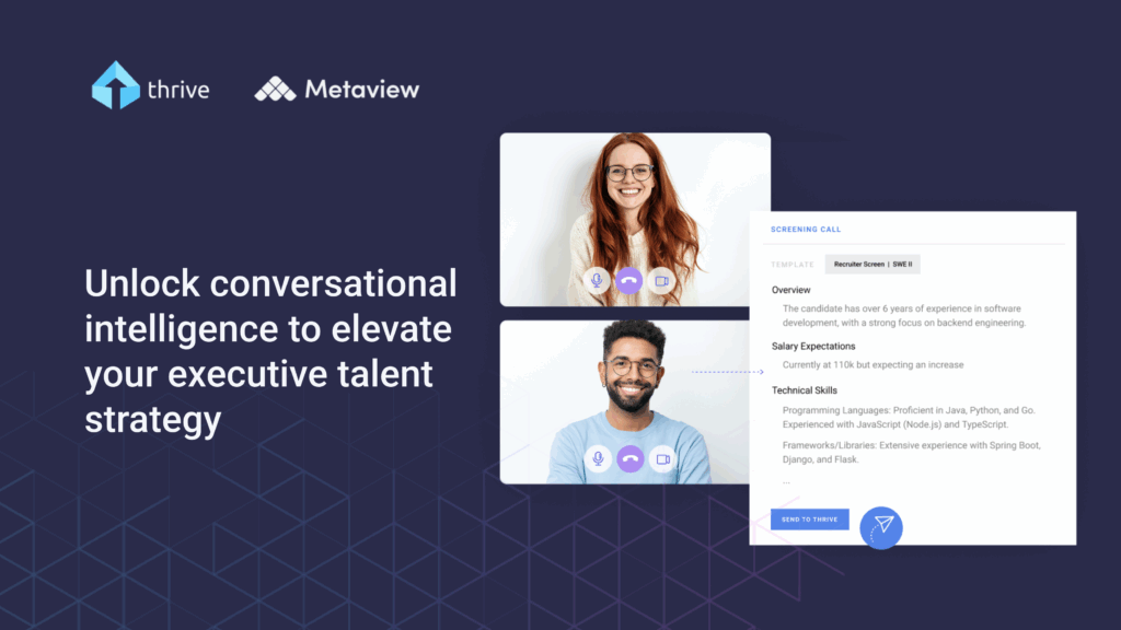If you work in executive search, at some point, you’ve been asked, “Who do we know in our network who possesses these specific skills?” And that’s when the pain of having your most valuable data scattered across multiple systems hits the hardest. You know you know someone, but their information may live in a different spreadsheet, in someone’s inbox, or worse, only in your team’s memory. A recent Thrive survey showed that 80% of talent leaders work with inconsistent or disorganized data, leading to duplicated research and missed opportunities. That’s why we launched a new integration with MetaView. It automatically captures and centralizes your executive talent data, saving you valuable time and helping you uncover hidden candidates from your own executive network later. Fixing the Data Leak Think of all the rich details you gather in conversations with candidates—their motivations, strengths, and specific experiences. Historically, this has been the biggest data leak in recruiting. This integration creates a bridge, turning your hiring conversations into a powerful, centralized, and searchable asset that helps you move from manual guesswork to AI-powered efficiency. The integration creates a seamless workflow between Metaview, an AI conversation platform that joins your audio and video calls and automatically takes detailed notes based on your custom instructions, and Thrive, a Talent Relationship Management (TRM) system built specifically for managing executive search projects and your passive candidate pipeline. Together, they allow you to automatically capture conversational data in MetaView and push it directly into a candidate’s profile in Thrive with a single click. This enriches your executive talent database, making previously undiscoverable candidates easy to find through a simple keyword search. 5 Steps to Capture and Centralize Your Data This integration automates the data-entry workflow, which is the most time-consuming part for executive talent leaders. Here’s how it works: Attend your video or audio calls as you normally would. MetaView will automatically join the conversation to record and transcribe it. You have full control over which meetings MetaView joins. You can configure it to skip meetings with specific clients or remove the AI notetaker in real-time if needed. You can also set custom data retention policies, and can feel confident that MetaView never trains its AI on your data and is fully compliant with GDPR and CCPA. Generate your AI notes. Once the call ends, MetaView processes the recording and organizes the transcript into structured notes that can be customized to your specific needs. These templates are sets of instructions you create to pull out the specific information you care about, such as a candidate summary, motivations for a new role, key strengths and concerns, and career history and accomplishments. Enhance notes with additional sources. You can enrich your notes by uploading additional sources, like a resume or a position description. MetaView’s AI will incorporate that information into the final summary, saving you the time of manually merging documents. Send Your Notes to Thrive. After reviewing and editing your AI-generated notes in MetaView, click the “Send AI Notes to Thrive” button. That’s it! The notes are now instantly transferred to the corresponding candidate profile in Thrive. Discover Candidates in Thrive. Because the notes from MetaView are now indexed on the candidate’s profile, they become fully searchable. You can run a keyword search in your Thrive database for a specific skill, like “machine learning models,” and uncover candidates who mentioned it in a conversation, even if it wasn’t listed on their resume. With this rich data now in Thrive, you can make your database even more organized and searchable without any extra manual work. For example, a candidate you spoke with a year ago might be a perfect fit for a new search, but you’ve forgotten the details of that conversation. Because their call notes are now searchable in Thrive, they will appear in your search results for relevant keywords, ensuring you don’t miss out on talent you’ve already vetted. Ready to get started? If you’d like to bundle both Thrive and MetaView, get in touch with our team.